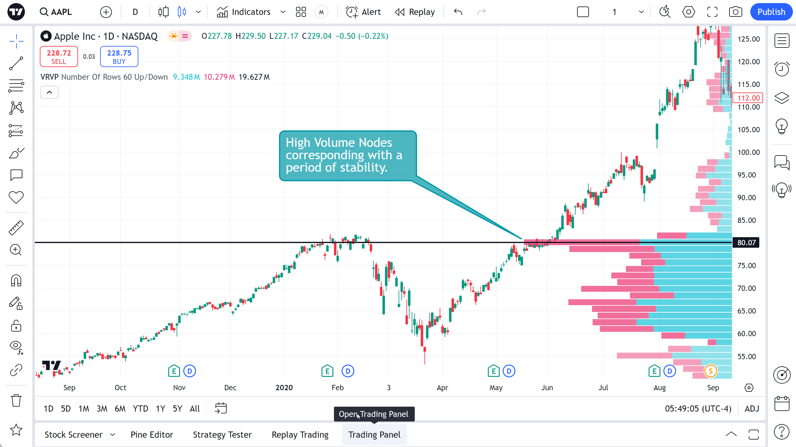 It showcases the sum of volumes from each candles, that appear on the screen visually, sums sell volume and buy volume separately and makes a relative histograms from these numbers.